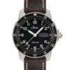 Die Longines Dolce Vita hat ein Quarzwerk, Edelstahl-Gehäuse, schwarzes Lederarmband, Dornschließe, graues Zifferblatt mit römischen Ziffern und einen kleinen Sekundenzeiger.