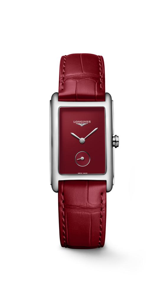 Longines DolceVita Durchmesser 23,30 X 37,00 mm Edelstahlgehäuse Zifferblattfarbe rot lackiert rotes Alligatorlederband mit Edelstahl-Dornschließe