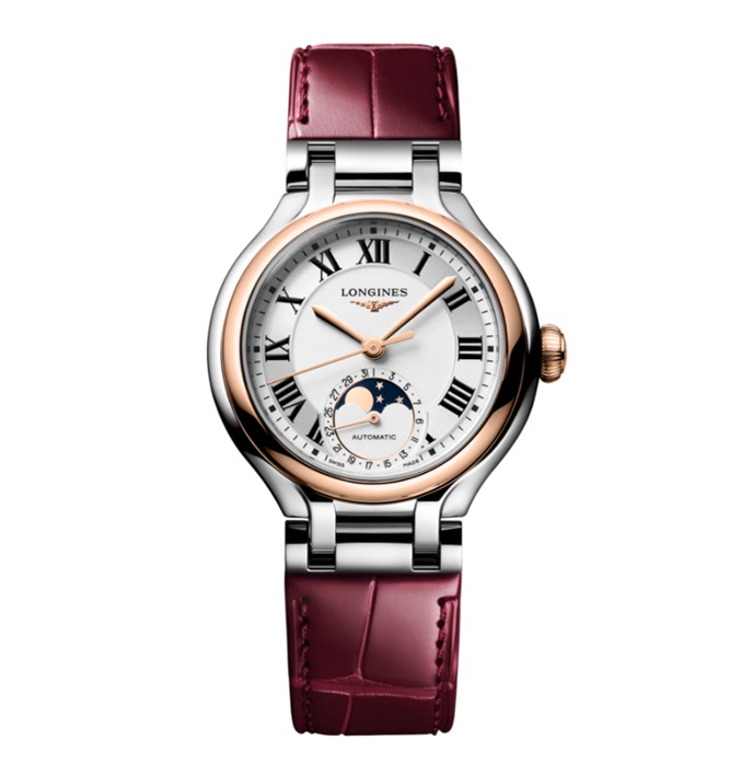 Longines Primaluna Moonphase, Automatik Uhr, Ø 34.00 mm, Edelstahl mit 18 Karat Roségold Cap 200. Gangreserve von ca. 72 Stunden, Alligatorleder mit Dreifach-Sicherheitsfaltschließe und Drückern